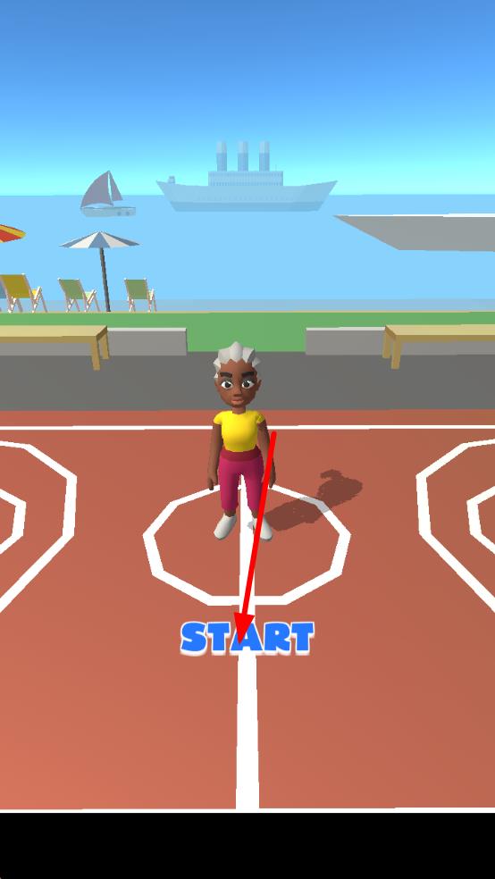 1、點(diǎn)擊START,角色進(jìn)入海濱籃球場,站定蹦床旁,熟悉場地布局,準(zhǔn)備開啟首局投籃挑戰(zhàn)。