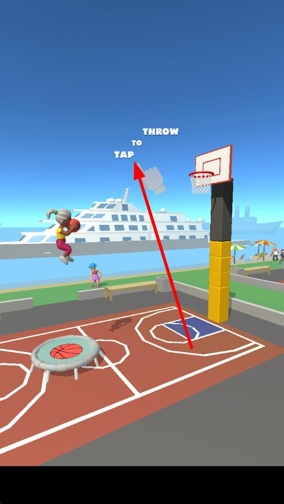 2、操控角色踏上蹦床,借助彈力騰空,屏幕提示THROW TO TAP時(shí),點(diǎn)擊屏幕投擲籃球,調(diào)整出手角度與時(shí)機(jī),瞄準(zhǔn)籃筐完成投籃。