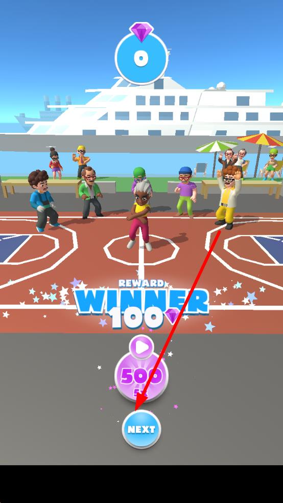 3、成功將籃球投入籃筐,場景顯示REWARD WINNER 100,點(diǎn)擊NEXT進(jìn)入下一關(guān),挑戰(zhàn)更復(fù)雜的蹦床布局與投籃角度,延續(xù)投籃闖關(guān)之旅。