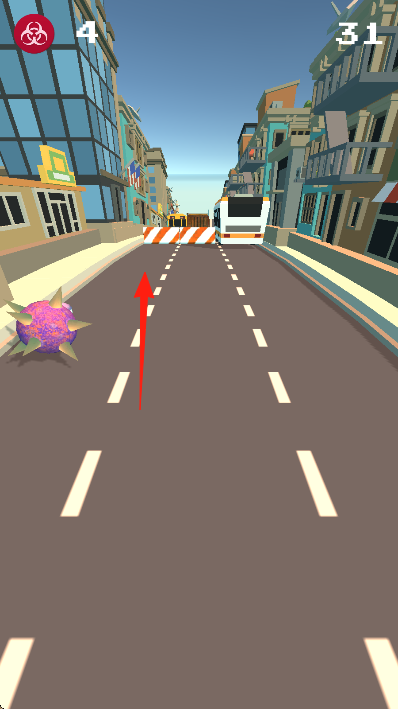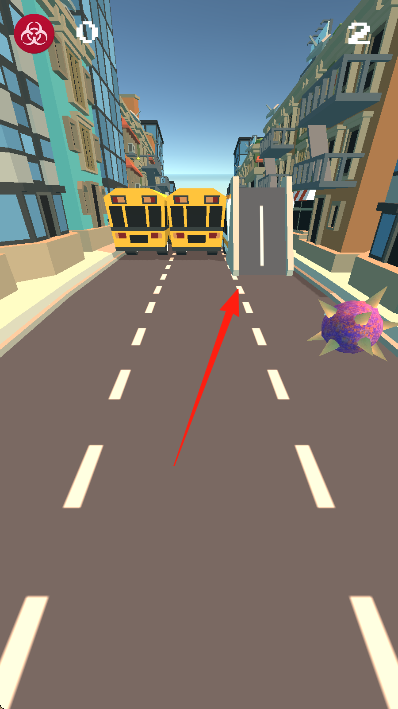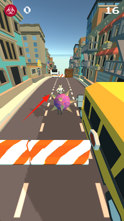 1、操控紫色刺球或類似球體在城市街道滾動(dòng),躲避黃色校車、路障橙白欄桿等障礙。