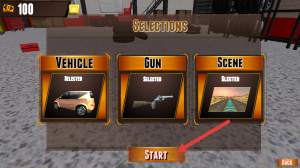 1、在車庫(kù)界面選定車輛、槍械與場(chǎng)景,均顯示已選狀態(tài)后,點(diǎn)擊下方START的按鈕,進(jìn)入冒險(xiǎn)關(guān)卡。