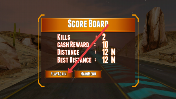 3、關(guān)卡結(jié)束后,在結(jié)算界面顯示擊殺、現(xiàn)金、距離等數(shù)據(jù)點(diǎn)擊PLAYAGAIN的按鈕,可以重新開始游戲。
