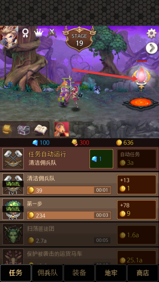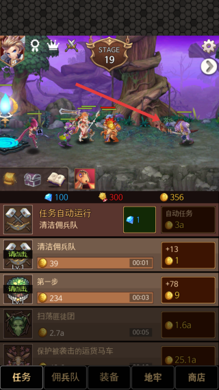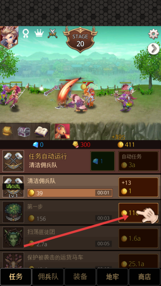 1、進(jìn)入關(guān)卡的頁面,下面可查看清潔傭兵隊和任務(wù)運(yùn)行,自動戰(zhàn)斗模式下,優(yōu)先點(diǎn)擊上方屏幕攻擊敵方。