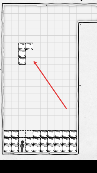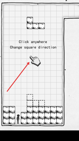 1、點(diǎn)擊屏幕任意位置,改變上方方塊組方向,使其下落填充下方空缺,為小人鋪路,注意觀察形狀適配。