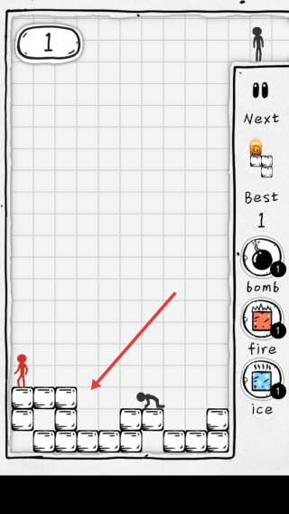 3、后續(xù)關(guān)卡利用炸彈、火焰等道具,清除障礙或輔助鋪路,操控小人躲避危險(xiǎn),抵達(dá)終點(diǎn)完成挑戰(zhàn)。