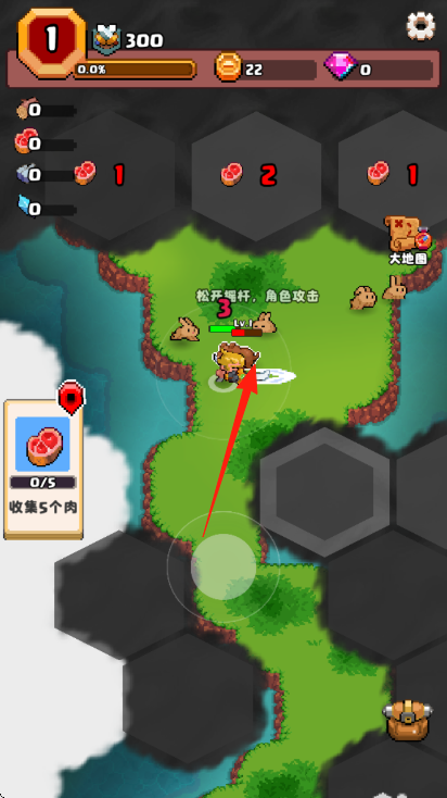 2、過程當(dāng)中注意左側(cè)的任務(wù)是收集5個(gè)肉,需擊敗怪物如兔子、松鼠獲取,戰(zhàn)斗時(shí)松開搖桿觸發(fā)攻擊。