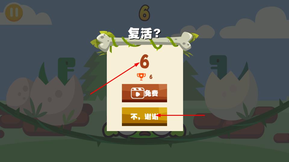 3、若角色失誤,彈出復(fù)活?界面,可點(diǎn)擊免費(fèi)按鈕觀看廣告復(fù)活,或選擇不,謝謝,重新開始游戲,嘗試刷新跳躍記錄。
