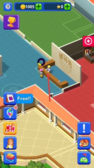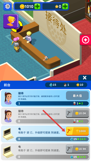 1、游戲開始時(shí),操點(diǎn)擊接待處的員工,觸發(fā)接待處要升級的地方。