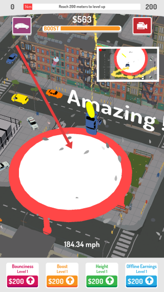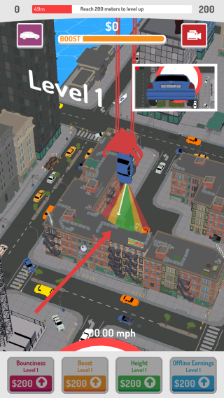 2、讓下落的汽車精準(zhǔn)掉落紅色蹦床區(qū)域,借助蹦床彈力向上彈跳,持續(xù)積累高度與距離,向著200米關(guān)卡目標(biāo)推進。