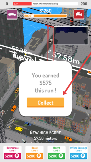 3、挑戰(zhàn)結(jié)束后,點擊彈出界面的橙色Collect按鈕,領(lǐng)取本次奔跑獲得的575美元獎勵,可用于提升Bounciness等屬性,增強后續(xù)表現(xiàn)。