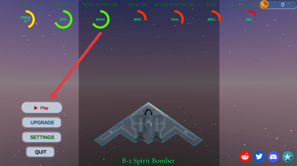 1、在B-2-Spirit-Bomber游戲主界面,點擊Play按鈕,進入關卡,駕駛隱形轟炸機開啟空中作戰(zhàn)任務,準備打擊地面目標。