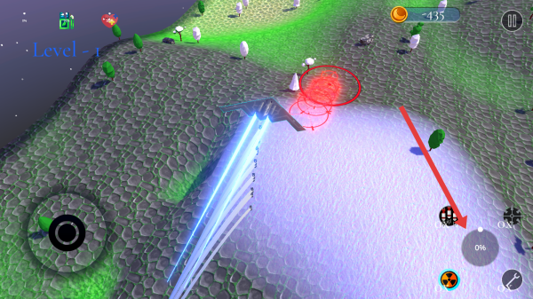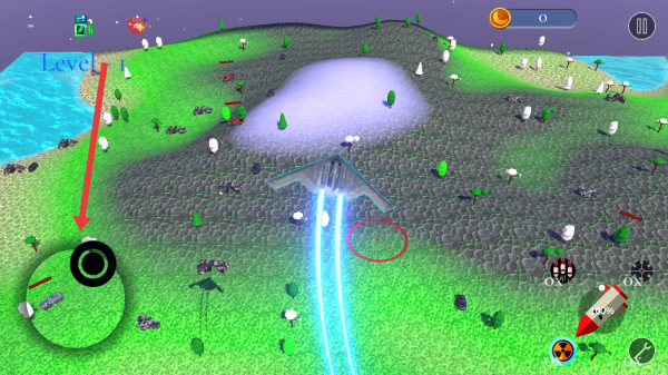 3、發(fā)現(xiàn)目標區(qū)域后,點擊右側(cè)炸彈投放按鈕,向標記點投擲炸彈,摧毀地面目標,推進Level-1關卡的戰(zhàn)斗進程。