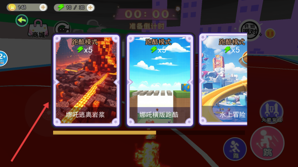 1、選擇哪吒逃離巖漿跑酷模式,進(jìn)入關(guān)卡,操控角色在巖漿上升場(chǎng)景中奔跑,收集鑰匙等道具。