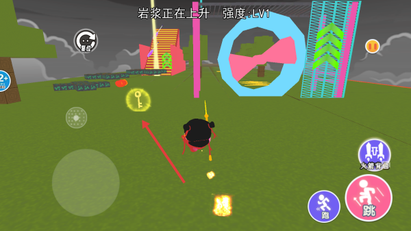 2、利用跑,跳按鈕跨越障礙,躲避巖漿,沿路徑前行,注意巖漿上升速度,強(qiáng)度LV1,保持移動(dòng)。