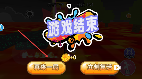 3、若角色被巖漿淹沒,點(diǎn)擊再來一局重新挑戰(zhàn),總結(jié)路線,優(yōu)化操作,爭(zhēng)取完成跑酷逃離巖漿。