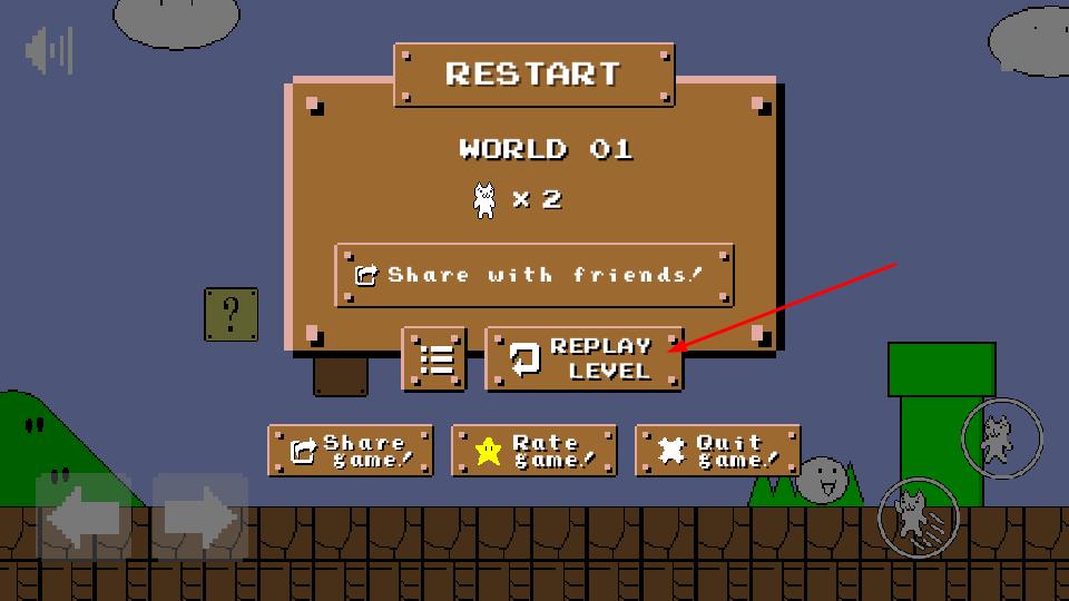 2、通過左側箭頭按鈕控制移動方向,右側按鍵觸發(fā)跳躍,需警惕場景隱藏陷阱如問號磚塊下的尖刺、敵人白色圓球、貓形怪,規(guī)劃行動躲避傷害。