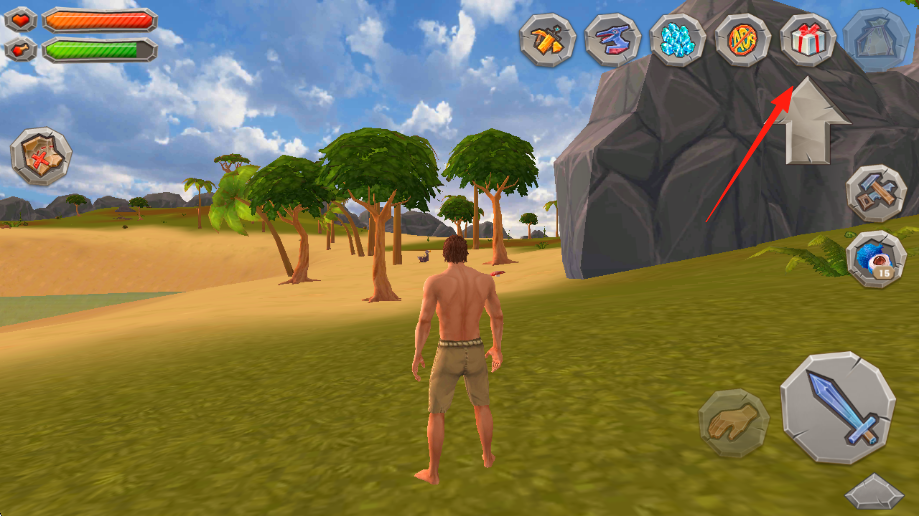 1、操控赤裸上身、穿短褲的角色,在海島場景樹木移動,利用界面技能,應(yīng)對生存挑戰(zhàn)。