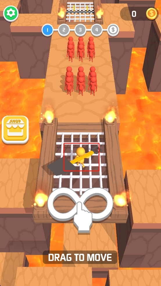 1、開局拖動(dòng)黃色小人,沿路徑前行,遇到紅色人群,利用武器推開,注意躲避火焰障礙,按提示操作通過網(wǎng)格區(qū)域。