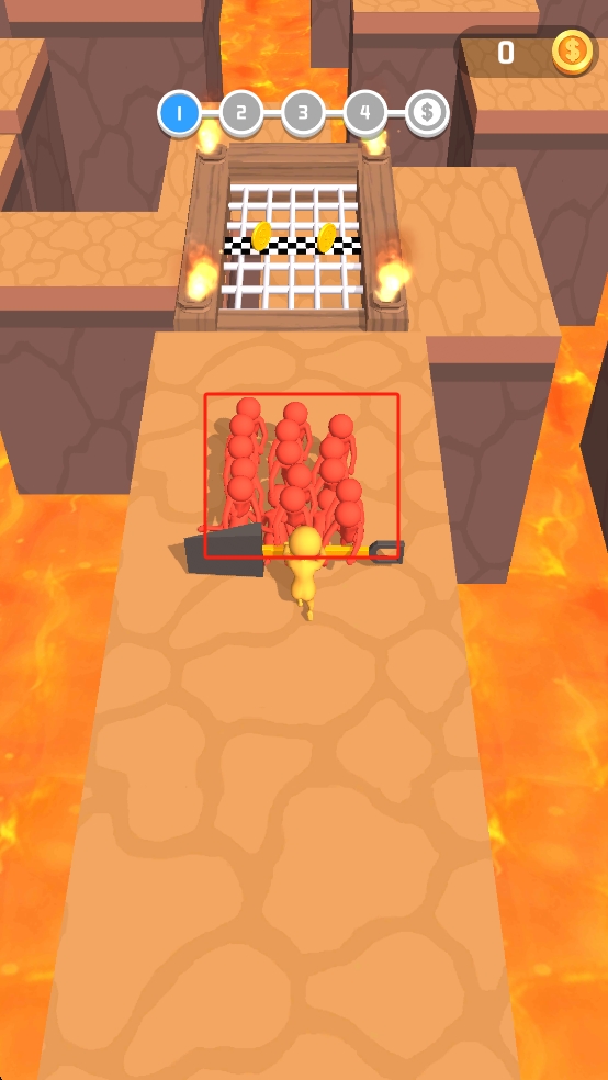 2、推進(jìn)過程中,集中力量推開紅色人群,保持移動(dòng)節(jié)奏,遇到金幣可順路收集,借助場(chǎng)景布局,高效突破人群阻攔。