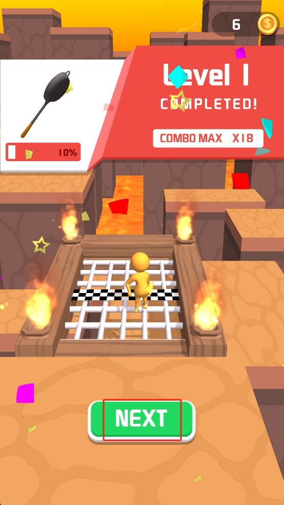 3、成功通關(guān)第一關(guān),界面會(huì)顯示本局的連擊數(shù)和得分,點(diǎn)擊綠色的NEXT按鈕,就能進(jìn)入下一關(guān)繼續(xù)挑戰(zhàn)。