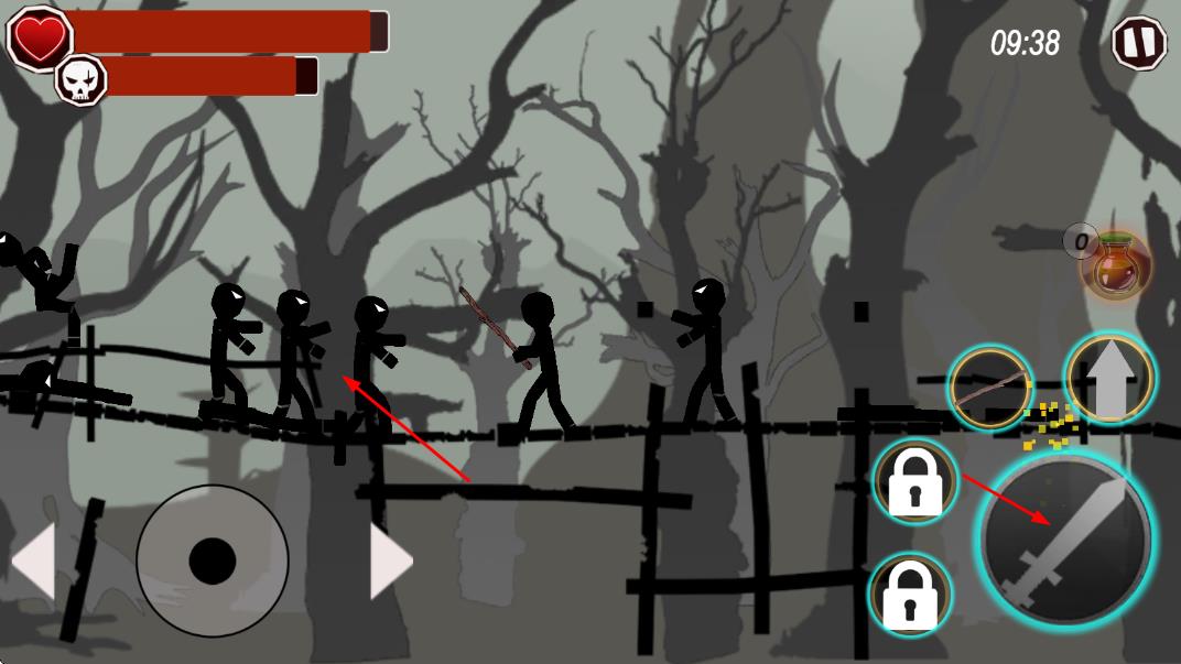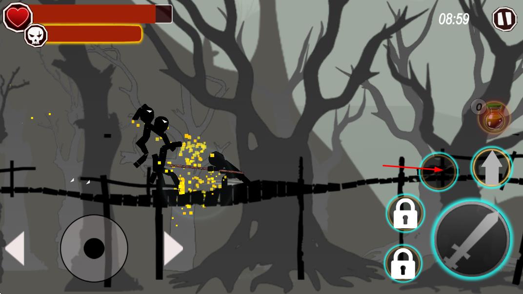 1、進入游戲后選擇關卡,操控火柴人通過方向鍵移動、跳躍,點擊攻擊按鈕消滅敵人,開啟基礎冒險闖關操作。