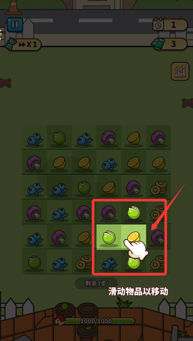 2、滑動(dòng)屏幕將相同蔬果排列成行,觸發(fā)連鎖消除獲得戰(zhàn)斗能量。