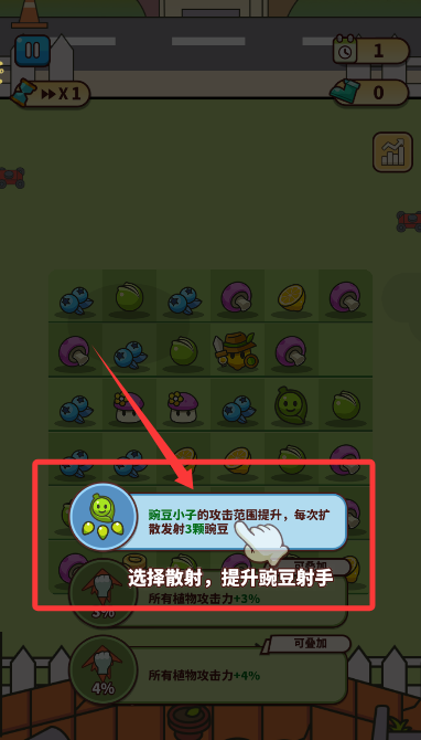 4、每次消除后,可選擇"射程強(qiáng)化"等增益效果,提升豌豆射手作戰(zhàn)能力。