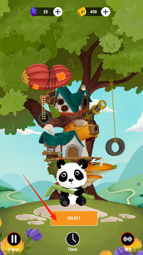 1、點(diǎn)SELECT按鈕可以給熊貓換造型,選好后就能開(kāi)始裝飾大樹(shù)啦,紫色寶石和金幣能用來(lái)解鎖樹(shù)上不同的小房子,先攢夠20個(gè)寶石把那個(gè)紅色熱氣球房子買(mǎi)下來(lái)特別劃算。