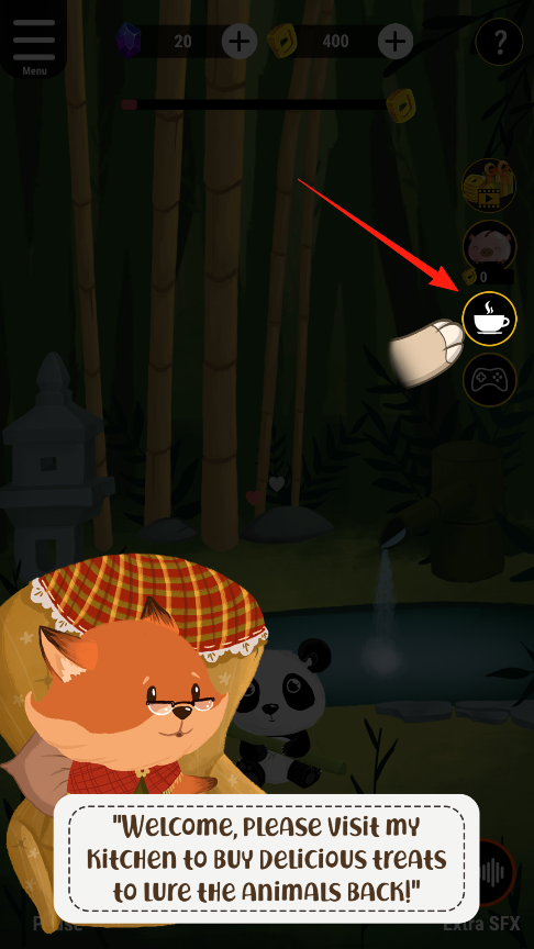 2、戴紅帽子的狐貍會(huì)提示你去廚房做美食,點(diǎn)咖啡杯圖標(biāo)就能進(jìn)入烹飪界面,用400金幣買(mǎi)些蜂蜜和蘑菇,做好料理后可以掛在樹(shù)上吸引小動(dòng)物回來(lái)做客。