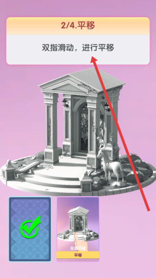 3、進入2/4.平移教學(xué)階段,遵循提示雙指滑動屏幕,平移建筑模型,掌握多手勢操作技巧,推進教學(xué)進度解鎖新內(nèi)容。