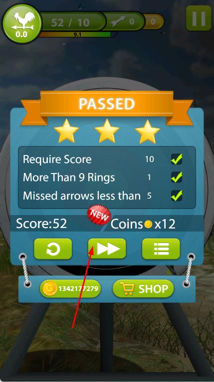 3、瞄準好后,釋放手指發(fā)射箭矢,命中環(huán)數(shù)獲得分數(shù),成功完成關卡任務后,點擊繼續(xù)按鈕進入下一個關卡。
