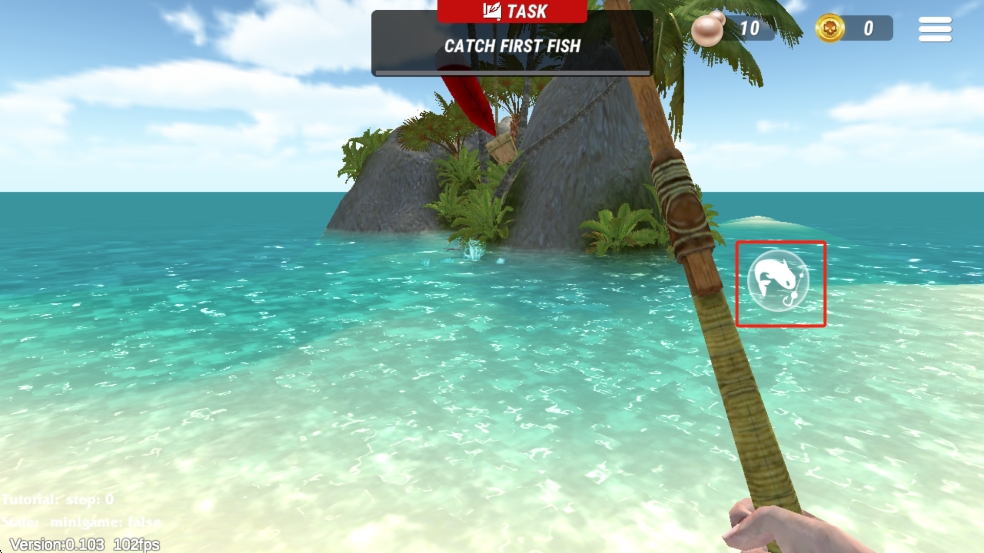 1、進(jìn)入作品后先查看任務(wù)提示,然后確認(rèn)魚竿位置,點(diǎn)擊其旁魚形圖標(biāo)完成拋竿動(dòng)作,耐心等待水下魚群靠近并咬鉤。