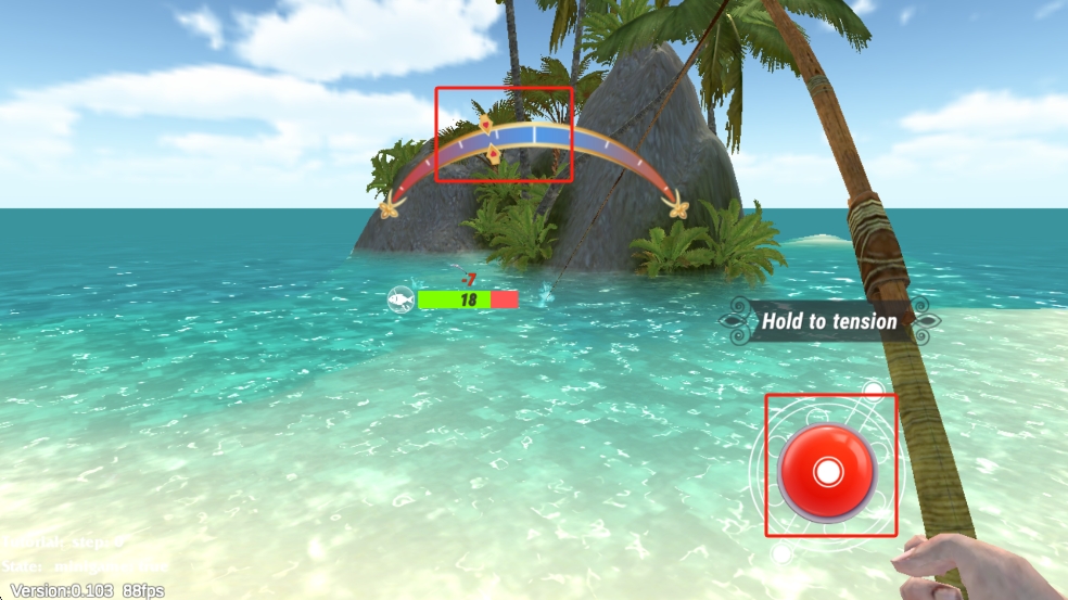 2、當(dāng)魚咬鉤后,屏幕會(huì)出現(xiàn)動(dòng)態(tài)拉力條,此時(shí)需迅速按住紅色按鈕控制拉力,確保指針?lè)€(wěn)定在合適區(qū)域內(nèi)。