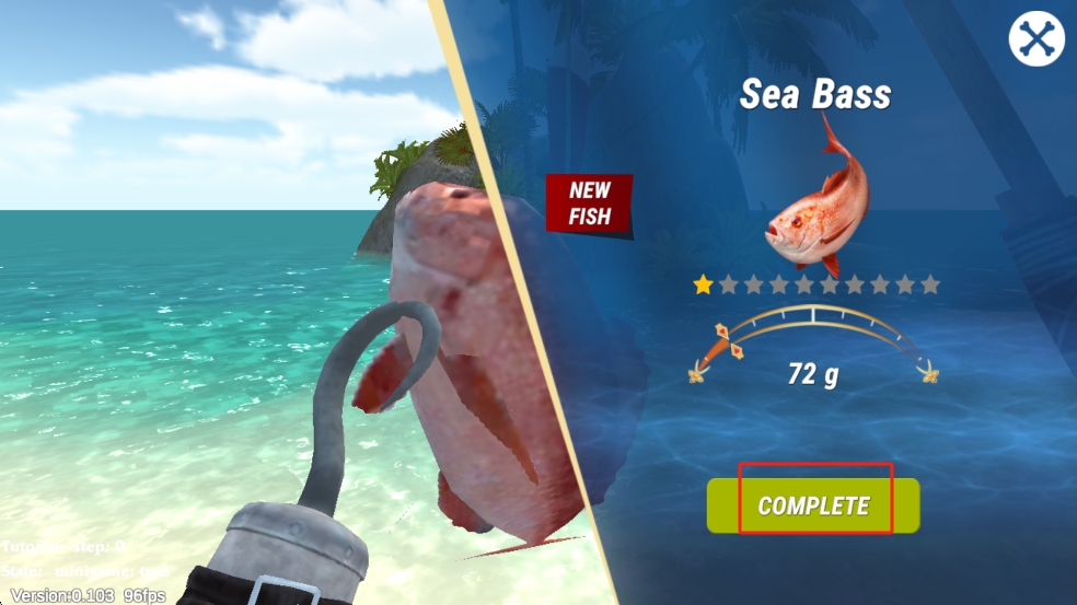 3、成功釣上標(biāo)注為72克的Sea Bass后,界面彈出完成提示,點(diǎn)擊COMPLETE按鈕結(jié)束當(dāng)前任務(wù),解鎖新的釣魚區(qū)域與魚種。