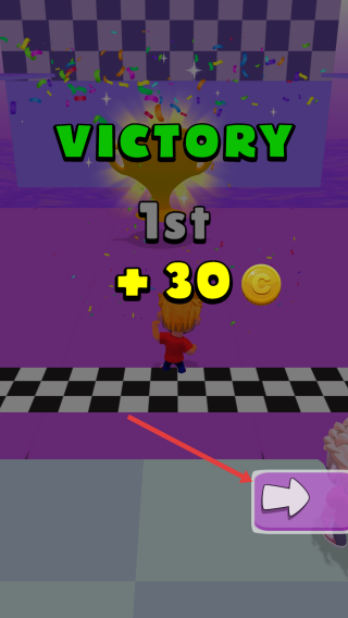 3、當(dāng)你成功到達(dá)終點(diǎn)并獲得第一名時(shí),你會(huì)看到VICTORY的提示,并獲得相應(yīng)的獎(jiǎng)勵(lì),此時(shí),點(diǎn)擊屏幕上的箭頭按鈕,即可繼續(xù)進(jìn)行下一輪游戲。