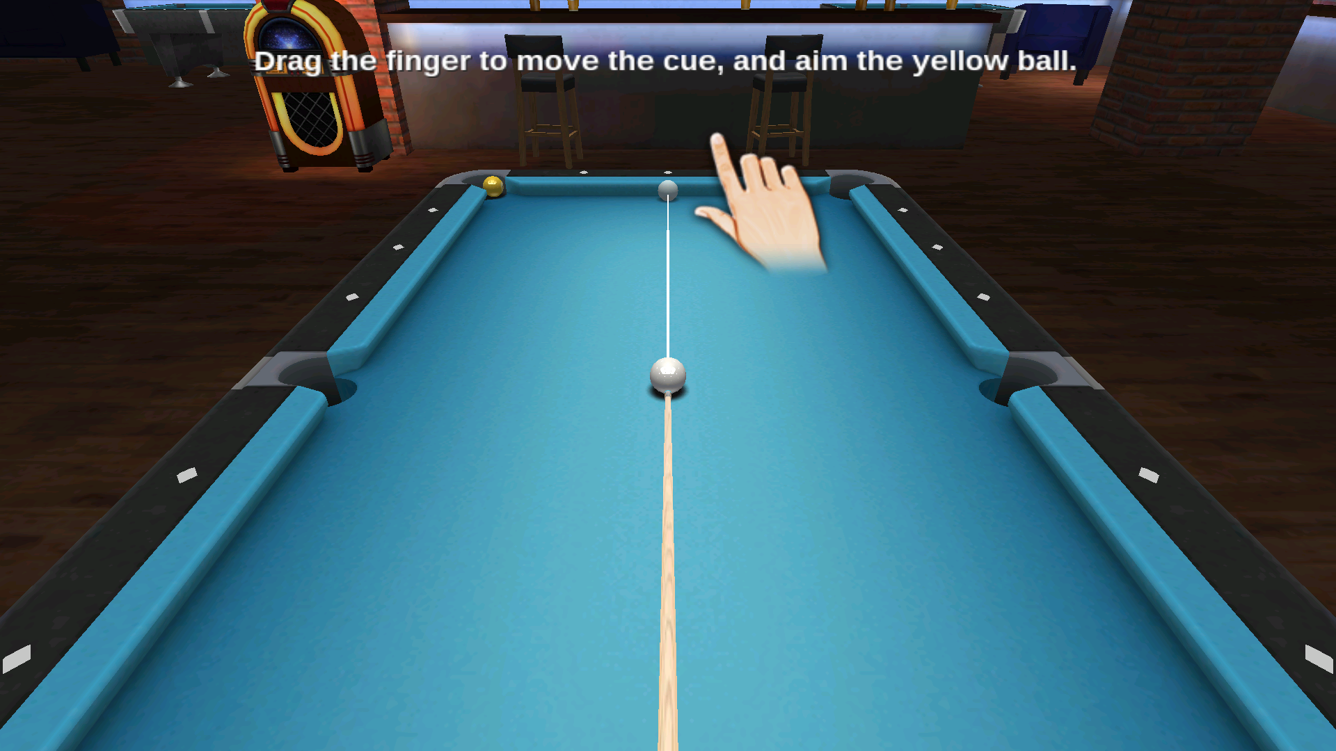 1、根據(jù)提示,用手指拖動(dòng)球桿,調(diào)整好角度,精準(zhǔn)瞄準(zhǔn)黃球,為擊球做好準(zhǔn)備。
