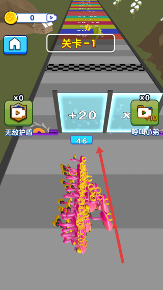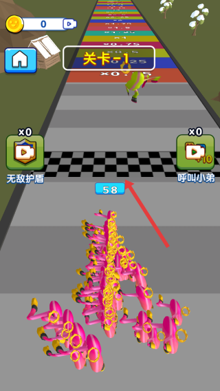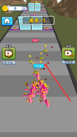 3、善用呼叫小弟功能看廣告獲次數(shù),關(guān)鍵節(jié)點(diǎn)補(bǔ)充人數(shù),沖向第一個(gè)關(guān)卡的終點(diǎn),完成挑戰(zhàn)。