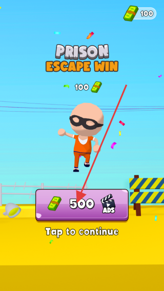 3、成功越獄后,界面顯示PRISON ESCAPE WIN,點擊標有500的按鈕,可獲得獎勵,繼續(xù)游戲。