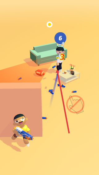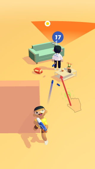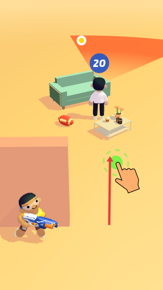 1、作為尋找者也就是拿槍的角色,射擊者點(diǎn)擊綠色的按鈕來(lái)瞄準(zhǔn),預(yù)判沙發(fā)后角色移動(dòng),射擊得分。