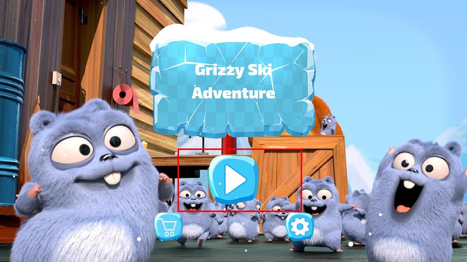 1、冰雪紋理的藍(lán)色標(biāo)題牌Grizzy Ski Adventure懸浮于畫面中央,下方嵌著圓潤的藍(lán)色播放按鈕,即可操控滑雪角色。