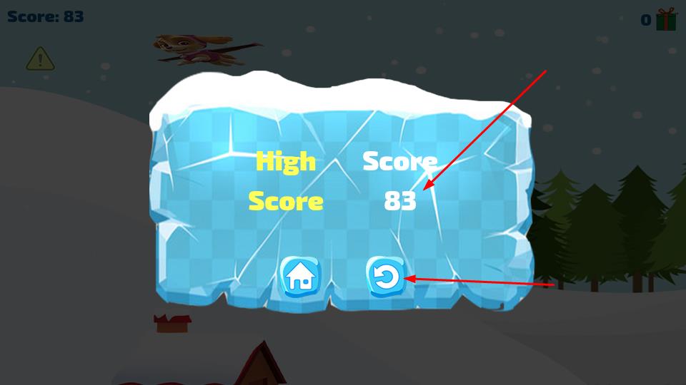 3、當(dāng)角色停止滑行,界面彈出覆雪的冰塊狀結(jié)算面板,亮黃色High Score字樣旁,清晰顯示本次挑戰(zhàn)的最終分?jǐn)?shù)。