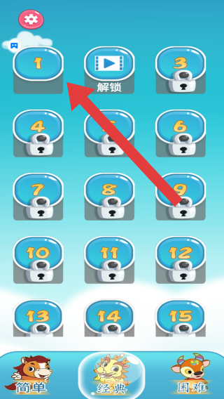 2、呈現(xiàn)了1-15關(guān)的關(guān)卡,目前只有第1關(guān)處于解鎖的狀態(tài),其余的暫未解鎖,新手玩家可以一步一步進行。