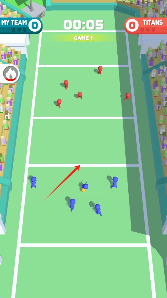 2、進(jìn)入游戲?qū)?zhàn)界面,集中精力,操控藍(lán)色隊(duì)伍,與紅色隊(duì)伍激烈對(duì)抗,點(diǎn)擊瞄準(zhǔn)扔球。