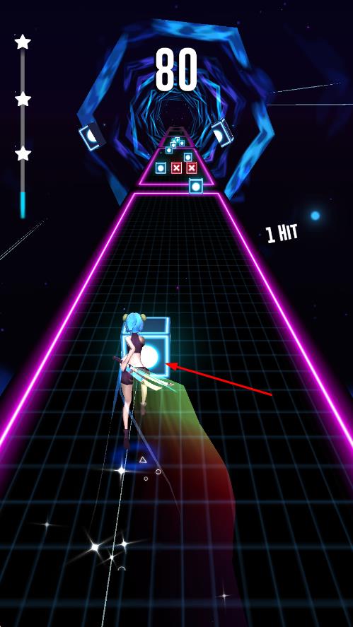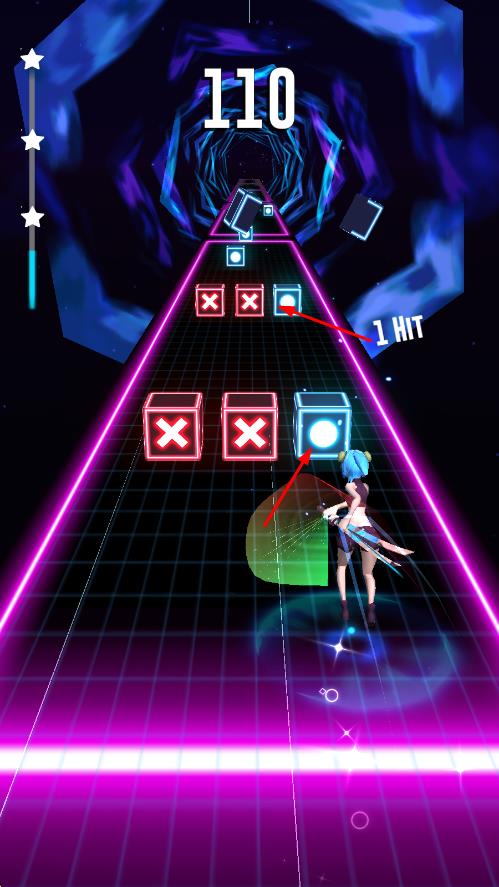 2、在音樂播放過程中,當方塊移動至指定區(qū)域時,滑動屏幕完成精準斬擊,積累連擊提升得分。