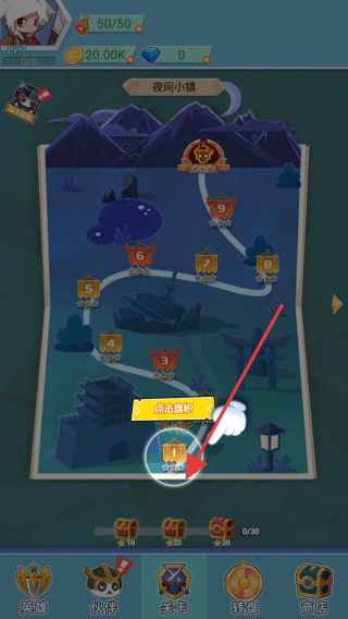 2、在關(guān)卡選擇界面,點擊標(biāo)有點擊繼續(xù)的按鈕,可進(jìn)入夜間小鎮(zhèn)關(guān)卡,開始游戲挑戰(zhàn)。