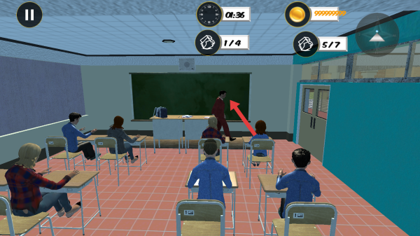 2、注意老師,在講臺(tái)前角色的巡視的范圍,他移動(dòng)避開(kāi)視線的時(shí)候,趁這個(gè)時(shí)間可以開(kāi)始攻擊,利用桌椅掩護(hù)。