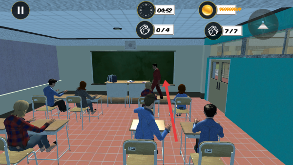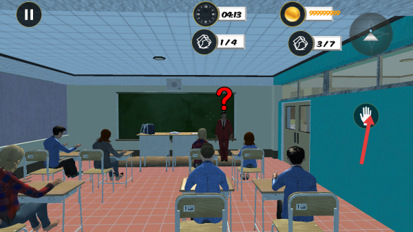3、道具收集進(jìn)度如0/4到1/4滿了后,觀察到老師到了主要的位置,點(diǎn)擊右側(cè)手掌的圖標(biāo),對(duì)老師進(jìn)行攻擊。