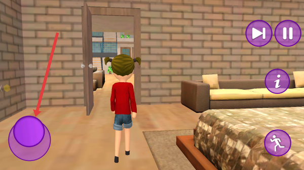 3、在游戲場景中,操作左側紫色虛擬搖桿,控制紅衣女孩在房間內移動,探索環(huán)境以推進關卡任務。