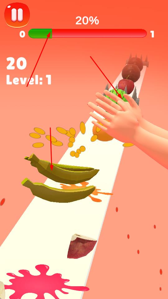 1、進(jìn)入Level 1關(guān)卡滑動(dòng)屏幕切割滾動(dòng)的水果,如香蕉、蘋果等,規(guī)避路徑上的尖刺障礙,上方進(jìn)度條隨切割推進(jìn)。