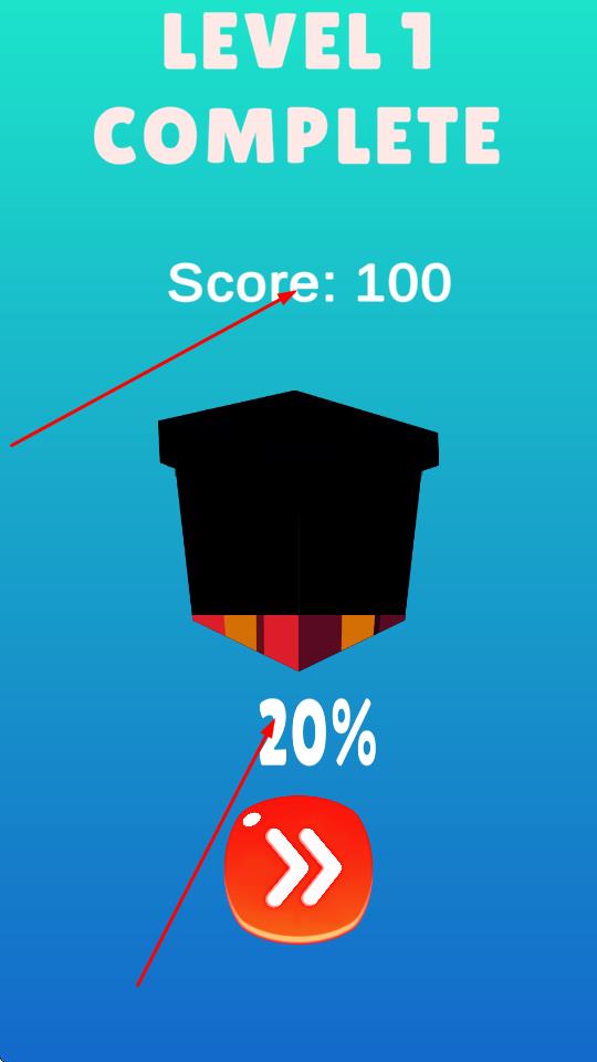 3、當(dāng)進(jìn)度條達(dá)20%,界面顯示LEVEL 1 COMPLETE,分?jǐn)?shù)為100,點(diǎn)擊紅色箭頭按鈕,即可進(jìn)入下一關(guān),挑戰(zhàn)更高難度。